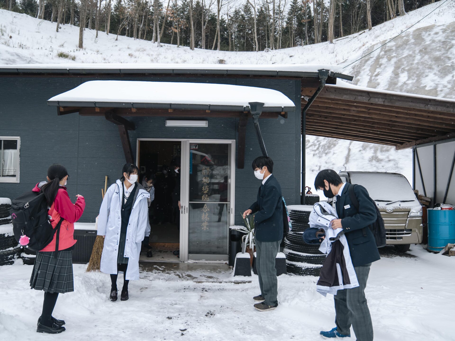 取材の当日は、2022年一番の雪が降った12月某日。私達は高千穂高校から五ヶ瀬町の那須総合林業さんに向かいました。高千穂町内はまだ雪もそこそこでしたが、五ヶ瀬町に入ったら本格的に積もっており道路も真っ白。これは「ある意味いい体験だ」と思いながらバスに揺られました。