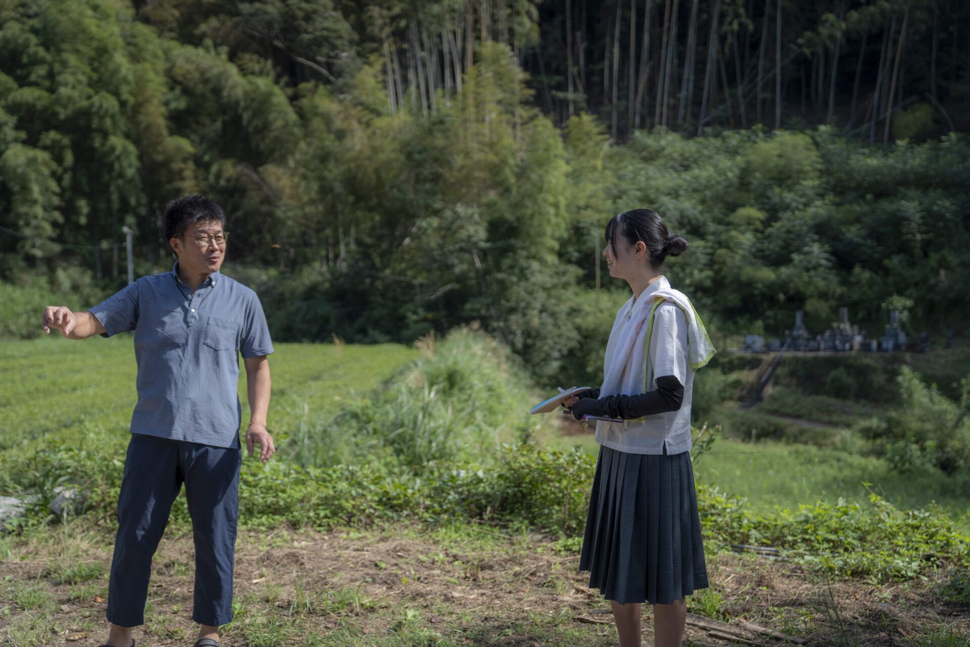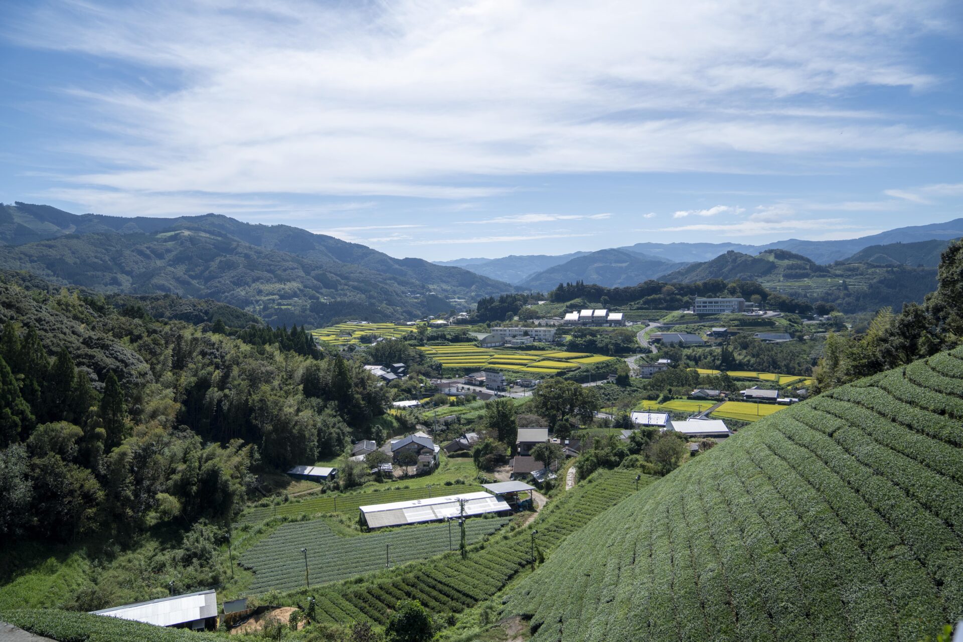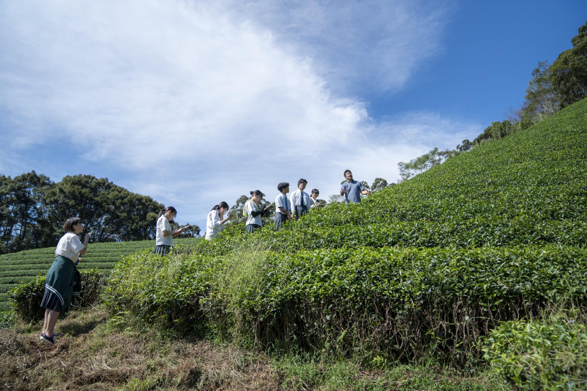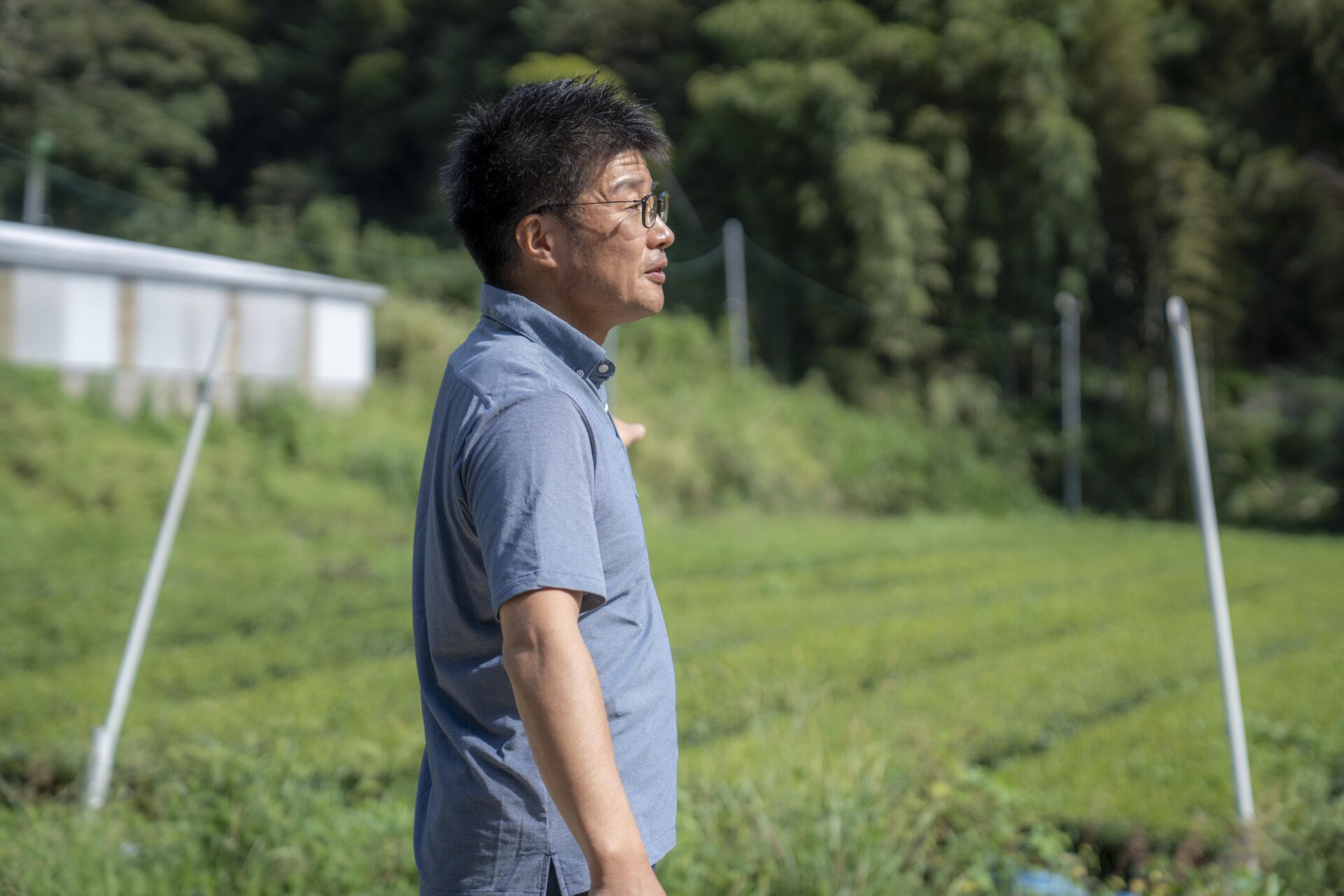 五ヶ瀬町から高千穂町を過ぎ10分程行ったところにある日之影町七折。バスを降りると斜面いっぱいにお茶畑が広がり、頭上には青い空が広がっていました。今回お話を伺ったのは、そこで斜面を切り開いてお茶の生産を行う一心園の甲斐鉄也さんです。