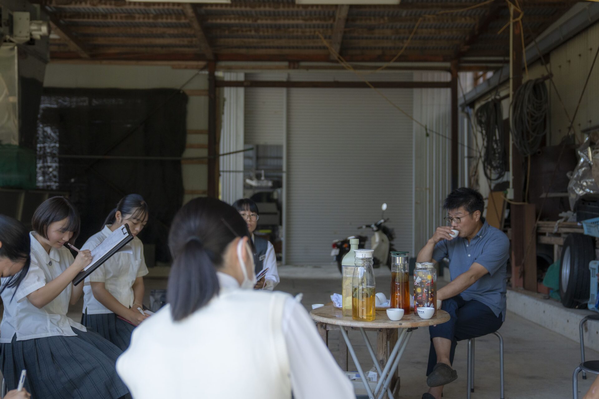 お茶畑の見学を終え、お茶を実際に飲ませていただきました。机の上に置かれた緑茶、烏龍茶、紅茶、ほうじ茶を見て、今まで見てきたどのお茶よりも色が綺麗で、美しく、非常に美味しそうだと思いました。一口飲んで見ると、口の中に香りが広がり、感動しました。苦すぎず甘すぎず、あっさりしていて飲みやすいなと感じます。紅茶が苦手な子も「一心園さんの紅茶はあっさりしていておいしい!」と言っていました。そんな人々を虜にする一心園さんのお茶は、鉄也さんの試行錯誤の結晶です!美しく、貴重なものだなと思いました。