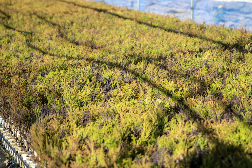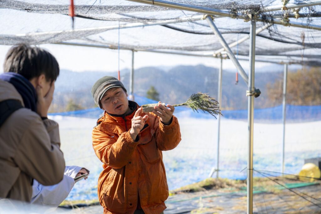 堀さんは伐採する仕事以外にも植林する苗を育ているとのことで、その現場を拝見しました。杉の苗って山の斜面に生えてるものかと思ったらそうではなくて、コンテナ苗と呼ばれるものを育てるそう。堀さんは約30,000本もの苗を出荷するそうです。コンテナ苗の利点は年中植えることができ、効率が良いとのこと。木を伐採するのに使う機械は1日で動かせるようになったそうです。伐採は手前から行っていき、木の重心でどっち方向に倒すか決めます。枝の先と曲がった木はバイオマスに使います。