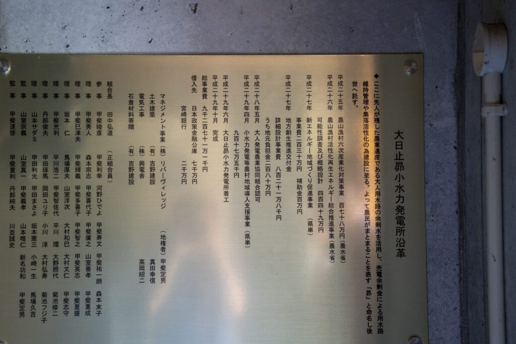 田中さんの呼びかけで、平成28年に大人発電農業協同組合が設立されました。農家ではない人も含め、公民館のメンバー全員が参加し、平成30年には「大日止昴小水力発電所」が完成しました。