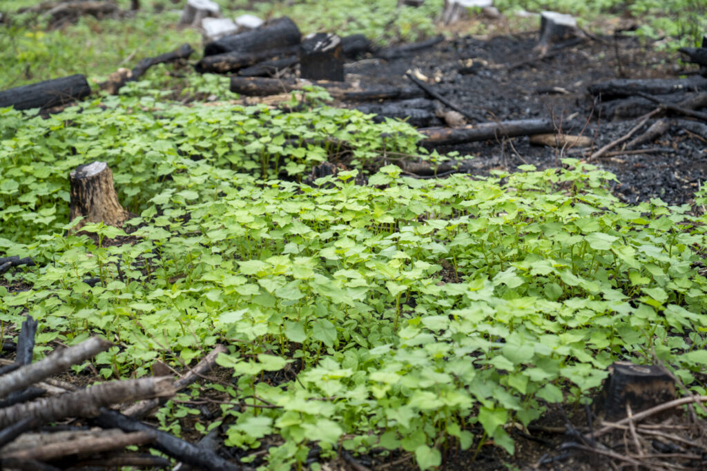 焼畑は、森林を伐採して火入れをし、その灰を肥料として作物を栽培する伝統的な農法です。灰を入れることで、雨で酸性化する土壌を中和させるはたらきがあります。